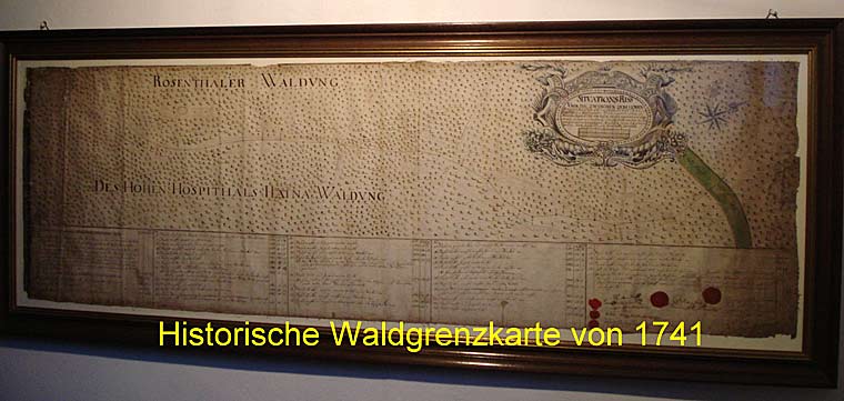 Die älteste Rosenthaler Grenzbeschreibung vom 27./28. Februar 1583, die in einer Sammlung von Amtsbeschreibungen zu finden ist, umfasst nur den Stadtbezirk Rosenthal, der allerdings ein besonderes Gericht bildete. Grenzzüge" gegen Haina und Rosenthal werden in den Amtsbüchern in den folgenden Jahrzehnten beschrieben. Kleine Grenzregulierungen sind immer wieder vorgekommen, doch sind sie zu bedeutungslos hierauf näher einzugehen. Die Grenze blieb stabil. Auf Vermessungs- und Versteinerungsarbeiten macht eine historische Grenzkarte im Treppenaufgang des Rosenthaler Rathauses aufmerksam. So ist zu lesen: Situations-Riss über die zwischen dem Hohen Hospital Haina und der Stadt Rosenthal befindlichen Waldgräntze, welcher gestalt selbige im Monath Junio 1741 von beyden theilen reguliret und abgesteinet worden." Diese historische Wandkarte gibt Aufschluss über den Grenzverlauf und den gesetzten 38 Markierungssteinen. Auf diesem Weg sind heute noch zahlreiche Grenzsteine aus den Jahren 1735, 1795 und 1826 anzutreffen. Einige von ihnen sind mit eingemeisselten Zusatzangaben wie:AH (Amt Haina) und A Ro (Amt Rosenthal) versehen.