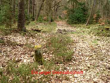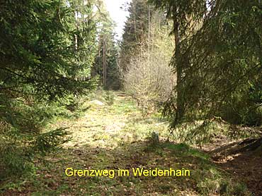 Frei übersetzt und ergänzt: Dort in der Waldflur Im kleinen Hegeholz", zwischen den Aemtern Wolkersdorf und Rosenthal, beginnt die Forstgrenze und verläuft durch den Trockenbach, quert den Sehlener Weg und führt auf dem Heerwege weiter durch Weidenhain bis an die Grenze von Hertingshausen. Als weitere Grenzmarkierungen werden der Dicke Driesch", der Viereckige Strauch", gezeichnete Bäume und uffworffe" (Erdwälle) genannt. Die Förster kontrollierten den Grenzverlauf und forderten wenn nötig die betreffenden Orte zu Grenzverbesserungen auf. Im 16. Jahrhundert waren hier Steine als Grenzmarkierung noch selten anzutreffen. Eichen- und Buchenstämme, Baumstümpfe, Erdaufwürfe, Steinklippen und Hecken waren als Grenzmerkmale üblich.
