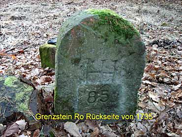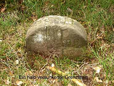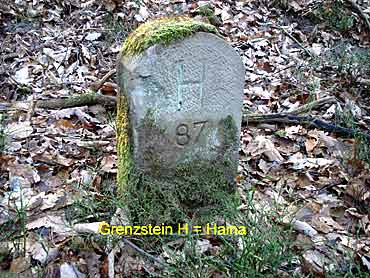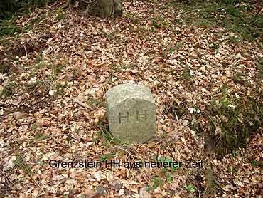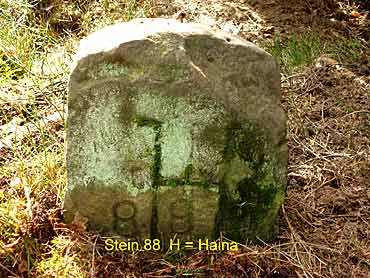 Der Hospital - Grenzstein sei hier als erstes genannt. Er steht gegenüber dem heutigen Walddistrikt-stein 326/104 etwa 12 Meter im Wald und trägt auf der Vorderseite einen profilierten hessischen Löwen. Auf der Rückseite ist das eingemeisselten HH (Hospital Haina) und die Jahreszahl 1795 sowie die Nummer 40 zu erkennen. Hier sind auch besonders gut die Erdaufwürfe der Ursprungs-grenzziehung zu sehen. Ein weiterer Grenzstein gleichen Formats steht etwa 100 Meter südwestlich am Beginn des alten Grenzweges. Der winkellig gehauene grosse Hauptstein trägt auf Rosenthaler Seite die Inschrift Ro" und auf der Kopfseite eine 1" (erster Grenzstein). Auf der gegenüberliegenden Seite HH" (für Hospital Haina) sowie 41". Auf Hainaer Seite erhielten die Steine später zusätzliche Nummern, aufsteigend von H (Haina) 41 bis H 89. Der Grenzweg verläuft von hier durch den Trockenbach, quert die ehemalige Bausse - Wiese und führt in Richtung Süden zur Kuppe, Spicherkopf, oberster Heuberg. Bachgrund, Heerwege, Weidenhain und weiter durch den Nassen Grund bis an den grossen Winkel - Stein, den sogenannten Dreiländerstein nordoestlich von Hertingshausen. Dieser Stein legt die Nahtstelle fest zwischen den drei Forsten Haina, Rosenthal - Stadt - und Rosenthal - Staatswald. Seine eingemeisselten Inschriften sind folgende: HH, Ro und eine 1" sowie ein G" für Gemünden. Auf der Kopfseite steht Nr.38". Einige alte Steine des Grenzweges sind zweifellos entfernt worden oder in dem zum Teil sehr sumpfigen Boden versunken. An anderen Stellen, wo früher Steine gestanden haben müssen, wurden neue Distrikt- und Grenzsteine aufgestellt.