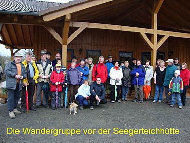Advent in der Hütte" am Seegerteich, so lautete das Motto dieser Wanderung zu der die Wanderführung auch Ueberraschungen angekündigt hatte. Gisela Kahler, Gerhard Werner und Kurt Seitz hatten diese Tour vorbereitet, die wegen der Witterungsverhältnisse noch kurzfristig eine Streckenänderung erfuhr. Der Rundwanderweg R 2 an Knöppelsbörnchen" vorbei zum Wetterwegblick" war eine gute Alternative, die den Teilnehmern auch einen Blick auf Rosenthal und dem Kellerwald-Höhenzug bescherte.