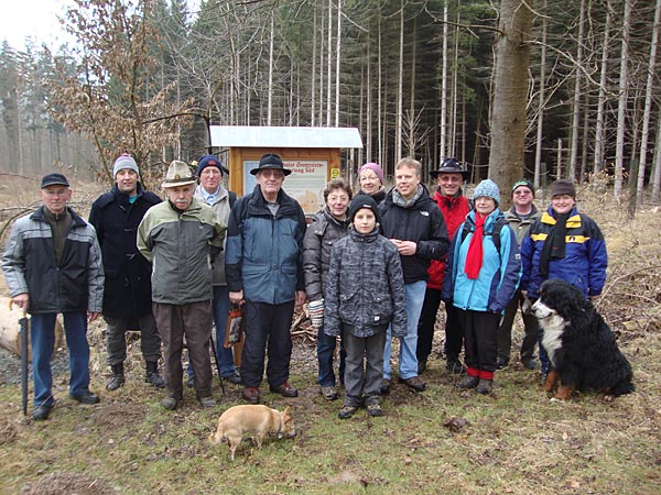 Jeder Stein ein Denkmal", lautete diesmal das Motto der zweiten Grenzsteintour zu einer außerplanmäßigen Exkursion des Vereins für naturnahe Erholung Rosenthal. Einst markierten sie die Grenzen, heute geht es um ihren Erhalt. Historische Grenzsteine sind steinerne Zeugen der Lokalgeschichte. Es gilt ihre Geschichte lebendig zu erhalten und Neugier bei Interessierten zu wecken sowie Kenntnisse über die manchmal versteckt liegenden Objekte und ihre Bedeutung zu vermitteln. Darum bemühen sich Helmuth Vaupel -Obmann für historische Grenzsteine- und Heimatforscher Günther Klingelhöfer. Sie wollen mit ihren Grenzsteinexkursionen zeigen welche verborgenen Schätze der Burgwald noch bereit hält. Entlang der ehemaligen Grenze des Deutschordenshofs Merzhausen waren die Wanderführer mit 14 Interessenten unterwegs und informierten über die einstigen Köhleröfen am Alten Rosenthaler Weg", über den ehemaligen Deutschordenshof und seine historischen Grenzsteine. Zu der Rundwanderung startete die Gruppe an den Köhleröfen. Hier wurde über die lange Tradition der Kohlenbrennerei im Burgwald berichtet, die in den 1940er und 1950er Jahren nochmals ein kurzes Aufblühen infolge des Rohstoffmangels nach dem Zweiten Weltkieg erfuhr. In den Kriegsjahren wurde medizinische Kohle produziert, in der Nachkriegszeit war es Holzkohle für die mit Holzvergaser umgerüsteten Kraftfahrzeuge. Hessen - Forst hat gemeinsam mit dem Landesamt für Denkmalpflege Hessen -Bau- und Kunstdenkmalpflege- Marburg einen gemauerten Köhlerofen restauriert und dauerhaft vor dem Verfall geschützt. Ihnen ist es zu danken, dass wir heute noch Einblick in die einstige Technik zur Holzkohlegewinnung nehmen können. Der Deutschordenshof Merzhausen gehörte zur Niederlassung der Deutschherren in Marburg. 1256 überließ Graf Berthold von Ziegenhain dem Deutschen Orden seine Güter in Merzhausen mit allem Zubehör. Bereits 1261 lässt sich ein von Mitgliedern des Marburger Konvents geführter Gutsbetrieb fassen. Durch die Auflösung geistlicher Besitzungen im Zuge des Reichsdeputationshauptschlusses verlor der Deutsche Orden 1809 seine Güter in der Ballei Hessen. Der Waldbesitz wurde Staatswald, das Hofgut Merzhausen in Erbleihe gegeben und dem Ortsverband Rosenthal eingegliedert. Das Anwesen wurde Privatbesitz. 1880 erfolgte der Verkauf an den Forstfiskus , der die Anlage als Forsthof nutzte. 1888 schied Merzhausen aus dem Ortsverband Rosenthal aus und wurde dem Gutsbezirk Oberförsterei Bracht und damit dem Kreis Marburg zugeschlagen. Heute befindet sich der Gebäudekomplex in Privatbesitz und wurde sorgfältig renoviert.