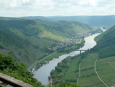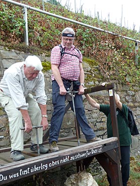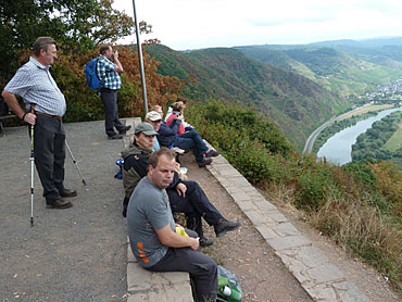 Die Etappe des letzten Tages führte von Senheim über Mesenich - Briedern und durch die "Briedener Schweiz" nach Beilstein (Wanderstrecke ca. 9 km). Gemeinsam starteten die Teilnehmer im schönen Weindorf Senheim. Der Aufstieg zu einem Hangweg wurde durch herrliche Ausblicke auf die Mosel und die Weinberge belohnt. Infotafeln gaben Auskunft auf die regionale Geologie und Architektur. Im Abschnitt Mesenich - Briedern folgten wir dem Kulturweg Mesenicher Steinreichskäpp". Es handelt sich um ein Mix aus Lehrpfad, Skulpturen- und Mitmachweg. Hier konnten sich einige Wanderer im Gewichtsheben und im Steine aufwiegen beweisen. Nach einer Rast teilte sich die Gruppe in Briedern. Ein Teil bestieg den Bus nach Beilstein während die größere Gruppe dem Moselsteig - Logo in die Briedener Schweiz" folgte. Auf einem steilen Pfad, der steil über dem Fluss verlief, war Trittsicherheit erforderlich. Zum Glück gab es keine größere Steigungen durch das felsige Gelände. Beide Gruppen trafen sich zum Schluss auf der Burgruine Metternich oberhalb von Beilstein. Der Aufstieg wurde mit einem herrlichen Ausblick auf die Mosel, und dem schönen Weinort Beilstein -mit Schiffsanleger und Personenfähre- belohnt. Der Abschluss dieser ereignisreichen Wanderung führte über eine Treppe durch das Zentrum des kleinen Ortes zum Parkplatz am Moselufer.