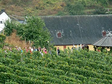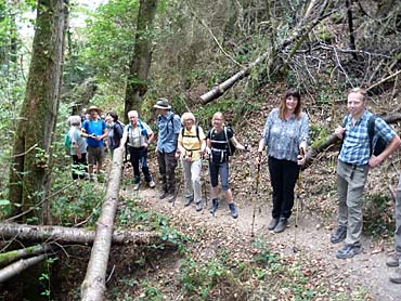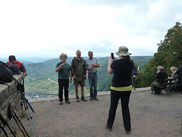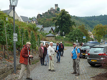 Am nächsten Tag stand der Abschnitt von Treis - Karden über die Burg Elz bis nach Moselkern an. (Wanderstrecke ca. 15 km). Start der Langstreckenwanderer im Zentrum von Karden. Der Aufstieg durch den steilen Hang führte durch wildwüchsiges Gelände (Weinbergmauern, Hecken, Gehölze) bis zur Schutzhütte mit einer herrlichen Aussicht auf die Mosel und Treis - Karden mit seiner mächtigen St.-Castor - Kirche. Nach einem flacheren Abschnitt folgte der Abstieg durch den Buchsbaumbuschwald in die wilde Schlucht des Krainbaches. Im unteren Abschnitt war die Strecke so felsenreich und schwierig, dass Drahtseile zur Sicherung vorhanden waren. Auf einem aussichtsreichen Weinbergweg wurde die Schutzhütte am Abzweig nach Müden erreicht. Nach einer kurzen Rast ging es auf einem Kreuzweg hinauf zum kleinen Weiler Mündenerberg und weiter zur Burg Elz. Die Kurzstreckenwanderer starteten hier ihre Wanderung zum gemeinsamen Ziel der Burg Elz. Erst auf einem Wald- und Prozessionsweg bis zum Forsthaus Rotherhof und weiter auf einem schmalen Kammpfad in das Elzbachtal. Nach einem kurzen Anstieg war die märchenhaft erscheinende Burg erreicht. Die längere Rast wurde zur Besichtigung und einer Einkehr genutzt. Mit frischen Kräften wurde die letzte Etappe des Tages nach Moselkern angetreten. Eine Treppe führte hinunter zur Elzbachbrücke, wo ein herrlicher, uriger Wanderweg oberhalb des Baches zur Ringelsteiner Mühle führte. Nach weiteren drei Kilometern war Moselkern erreicht. Der Bus brachte beide Gruppen zurück in das Hotel. Trotz anstrengender Wanderung klang der Tag mit einem musikalischen Abschlussabend mit -Tanzeinlagen- aus.