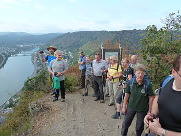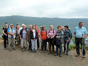 35 Wanderer und Gäste des Vereins für naturnahe Erholung -Wandern- Rosenthal erlebten ein sonniges Wochenende an der mittleren Mosel. In der Urlaubsregion Ferienland Cochem, die sich vom Bremmer Calmont bis Klotten erstreckt, wurden drei Tageswanderungen auf dem Moselsteig erwandert. Der Standort Bruttig - Fankel mit dem Hotel Rebstock war ein idealer Ausgangspunkt aller Wanderungen. Bereits am Anreisetag starteten die Wanderer in zwei Gruppen von Bremm zum Gipfelkreuz am Calmont. Während eine Gruppe den steilen Aufstieg auf dem Moselsteig unternahmen, setzte der Bus die zweite Gruppe auf einem Wanderparkplatz zu einer kürzeren Strecke ab. Die Aussicht auf die Moselschleife von Neef bis Edinger - Eller, den Petersberg und das Hunsrück - Hinterland war spektakulär. Der Moselsteig führt auf dem Calmont - Dach weiter in Richtung Eller. Zwei weitere Höhepunkte erwarteten die Wanderer auf dem Kammweg. Ein rekonstruiertes römisches Bergheiligtum (Tempel aus dem 2.-4. Jahrhundert vom Typus des gallrömischen Umgangstempels) und nach wenigen Metern eine Aussichtsplattform von der aus der Fluss in vier getrennten Abschnitten als Canyon mit vier Seen erscheint (Vierseenblick). Während eine Gruppe über den Klettersteig und der Galgenlay - Hütte nach Eller abstieg, wanderte die zweite Gruppe in mehreren Serpentinen durch die wilde Felsenlandschaft mit ihren engen, steilen Passagen ins Ellerbachtal hinab. (Wanderstrecke ca. 10 km). Nach Aufnahme der Kurzstreckenwanderer nahm der Bus auch die Teilnehmer der langen Strecke am Wanderparkplatz in Eller auf und startete zur Fahrt in das Hotel. Da es sich um ein Winzerhotel handelte, schloss sich nach dem Abendessen eine zünftige Weinprobe an.