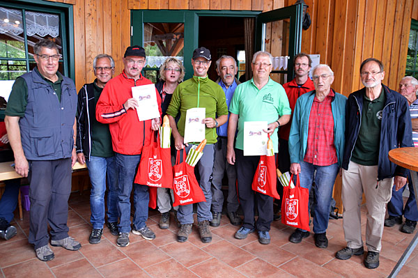 Der 15. Rosenthaler Wandertag Trotz der ungewissen Wettervorhersage machten sich 195 Wanderer mit ihrer Startkarte auf den Weg durch den Burgwald. 21 von Ihnen entschieden sich für die 20 km lange Extratour Franzosenwiesenweg". 60 Wanderer legten 5 km und 114 Wanderer 11 km zurück. An drei Rastpunkten bot sich die Möglichkeit einer Stärkung. Während des gemütlichen Beisammenseins am Ziel, der Seegerteichhütte", begrüßte der Vorsitzende Karl-Walter Lay alle Wanderer und Gäste, unter ihnen den Vorsitzenden des Vereins Region Burgwald-Ederbergland" Volker Heß sowie den Vorsitzenden des Hessisch - Waldeckischen Gebirgs- und Heimatvereins Hubert Thorwirth, und dankte für ihr Kommen. Dank galt insbesondere allen an der Organisation des Wandertags Beteiligten, darunter dem Wanderführer Hermann Möscheid und den 40 Helfern. Lay ging auf das diesjährige Motto 10 Jahre Extratour Franzosenwiesenweg" ein und wies darauf hin, dass der Rosenthaler Wanderverein an der Einrichtung und der ständigen Pflege des Weges und seiner Kennzeichnung durch die Wegepaten nicht unerheblich beteiligt war und ist. Jeder Teilnehmer erhielt ein kleines Geschenk. Der zahlenmäßig am stärksten vertretene Verein war mit 30 Teilnehmern wieder einmal der Wanderverein Wetter, gefolgt von dem Frankenberger Gebirgs- und Wanderverein (14) und der Wanderabteilung der Lichtenfelser Sportgemeinschaft (12). Unter den Rosenthaler Vereinen siegte der TSV mit 28 Teilnehmern, gefolgt von dem Verein Festteam & Kulturkreis" (19) und dem Rosenthaler Gesangverein mit den Sparten Männerchor und Rose Valley Singers. Mit 85 Jahren war Adam Ertl der älteste Wanderer, mit 4 Jahren Lena Koch die jüngste Wanderin, beide aus Rosenthal. Der Vorstand überreichte die Urkunden und Preise. |