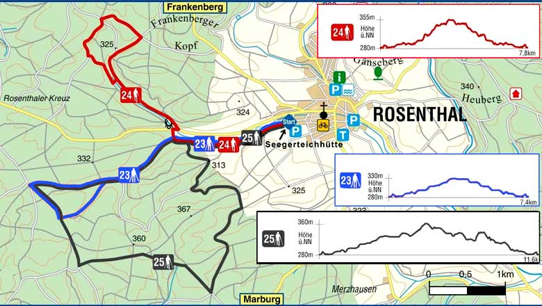 S 23 Gänsewiesental bis zu den Herrenbänken, zurück überHans-Glas-Weg, fester Waldweg, leichte Steigung, 7 km S 24 Rodebachtal zum Teich, durch Buchenwald bergauf, befestigt. Waldweg, ca. 30 m Straße, Steigungen im Mittelteil, ca. 8 km S 25 Identisch mit S 23 bis Herrenbänke, über Stern, Wetterweg, mit schönem Rundblick am Waldrand befestigt. Waldweg, Steigungen im Mittelteil, ca 11 km |