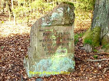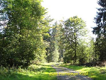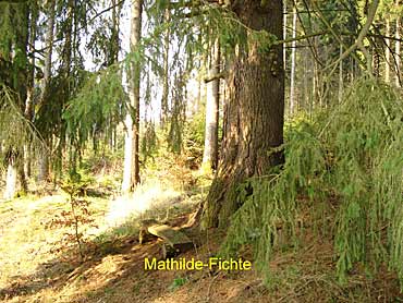 Auf dem Douglasienweg" hinunter setzen wir die Tour fort, folgen dem Horizontalweg" am Hang entlang und verlassen diesen nach wenigen 100 Metern nach links zur Wegekreuzung Zum Rodaer Tor" (Zugang: R 5 + R 6). Der befestigte Forstweg Am Hainschen Kopf" entlang führt uns nach rechts weiter in das Fischbachtal", ein ebenfalls reizvoller Talgrund mit historischer Vergangenheit. (Kum 50,0) Bevor wir den Talzug queren passieren wir rechts am Waldrand die Mathilde-Fichte" mit einer rustikalen Sitzbank.