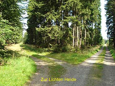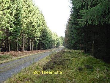 Vorbei am Parkplatz gelangen wir zur Landstrasse L 3076 zwischen Rosenthal und Frankenberg (Km 40,5). Wir überqueren die Strasse und wandern zunächst durch Fichtenwald um nach 500 Metern die Waldflur Lichte Heide" zu erreichen. (Abgang: Quernstweg) Nach weiteren 500 Metern treffen wir auf den nach links führenden Lärchenweg dem wir bis zum Abzweig Theerhütte folgen. Der Forstweg führt uns zum idyllisch in Waldwiesen eingebetteten ehemaligen Forsthaus Theerhütte (390 m NN) (Km 42,5), womit wir den nördlichsten Punkt des Rundwanderweges Tälerring erreicht haben. Die Bezeichnung Theerhütte geht auf einen in der Mitte des 18Jh.angelegten Teerofen zurück. Nach dem Tod des letzten Teerbrenners gelangte das Gebäude in Forstbesitzt . Im Garten der Försterei zeigten vor Jahren noch schwarze Teerbrocken den Standort des Ofens.