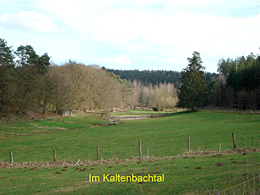 Wir bleiben auf dem Talweg, wo uns alsbald ein weiterer schöner Talgrund, das Kaltenbachtal (Km 43,0), aufnimmt. Neben Weideflächen sind kleine Fischteiche zu sehen. In weiten Bögen wandern wir wechselweise am Waldrand entlang oder durch Wald mit idyllischen Waldwiesen, wo wir in Ruhe und Beschaulichkeit die Landschaft des nördlichen Burgwaldes geniessen können. Nur wenige Kilometer Luftlinie von hier entfernt -oberhalb Willersdorf- befindet sich mit Knebelsrod" (443 m) die höchste Erhebung des Burgwaldes. Geologisch gesehen geht hier der nördliche Burgwald in das Frankenberger Hochland über.