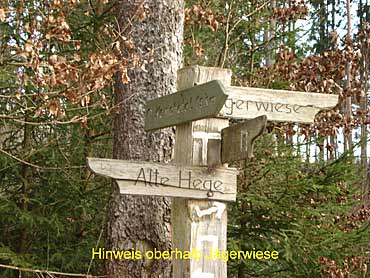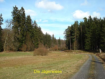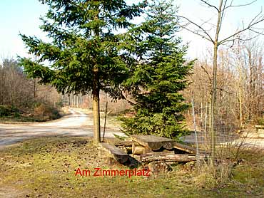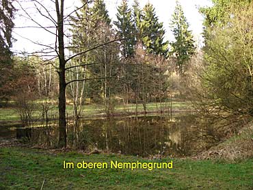 Wir verlassen nach rechts hinauf auf einer sanften Steigung das Kaltenbachtal (Zugang: Quernstweg) und gelangen alsbald zur Oberen Nemphe" (Abgang: Quernstweg). Auch hier eine reizvolle Waldlandschaft die sich uns mit einem weiteren Talzug bietet. Wir kommen zu den Jägerwiesen". Sanft abfallend führt der Weg entlang an Wiesen, kleinen Erlenbruchwäldern und vorbei an zwei Teichen. An der Wegekreuzung (Km 47,0) verlassen wir nach links hinauf den Talzug und kommen über den Balzrücken" nach 1100 Metern zum Zimmerplatz" (403 m NN) (Rastplatz) (Km 48,0). Eine kleine Sitzgruppe lädt inmitten der fünfarmigen Kreuzung zur Rast ein. An dieser Stelle haben wir den höchsten Punkt unserer Rundwanderung im nördlichen Burgwald erreicht.