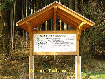 Nun gelangen wir zur anderen Seite des Wiesengrundes (Zugang: R 3 + R 4) und wandern nach links in das Tal hinein wo wir alsbald die Infotafel zur ehemaligen Siedlung Thalhausen" erreichen. Das Dorf lag im oberen Fischbachtal und wird 1329 urkundlich erwähnt (300 m NN). Im Jahr 1554 wird es bereits wieder als Wüstung bezeichnet. Die Gehöfte der Siedlung lagen weit verstreut im Tal und waren auf Podien gebaut. Bis 1700 bestand noch die Thalhäuser Mühle".