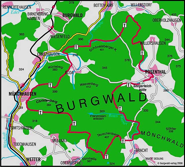 Das Burgwaldstädtchen Rosenthal wurde 1327 als mainzische Stadt und Vorposten im Streit um das hessische Lehen gegründet, kam jedoch 1464 zur Landgrafschaft Hessen und wurde 1866 preussisch. Zur Sicherung ihres Territoriums erbauten die Mainzer Erzbischöfe in Rosenthal eine Burg mit Turm und schützten diese Anlage durch eine Ringmauer. Rosenthal besass keine Stadtmauern sondern nur Wallgräben. Es gab aber mit dem Obertor", Fischtor" und Dammtor" drei Stadttore, die aber zwischen 1796 und 1831 abgebrochen wurden. Sehenswert ist das heute so schmuckvolle Rathaus -erbaut anno 1654- das mit anderen Fachwerkgebäuden im Stadtkern nach dem grossen Stadtbrand von 1595 entstand. Auch die evangelische Stadtkirche hat ihr heutiges Aussehen im Jahre 1888 nach umfangreichen Umbaumassnahmen erhalten. Der im Ortsbereich vorgegebene Wanderweg bis zur Seegerteichhütte (Km 54,0) lässt sich auch individuell erwandern.